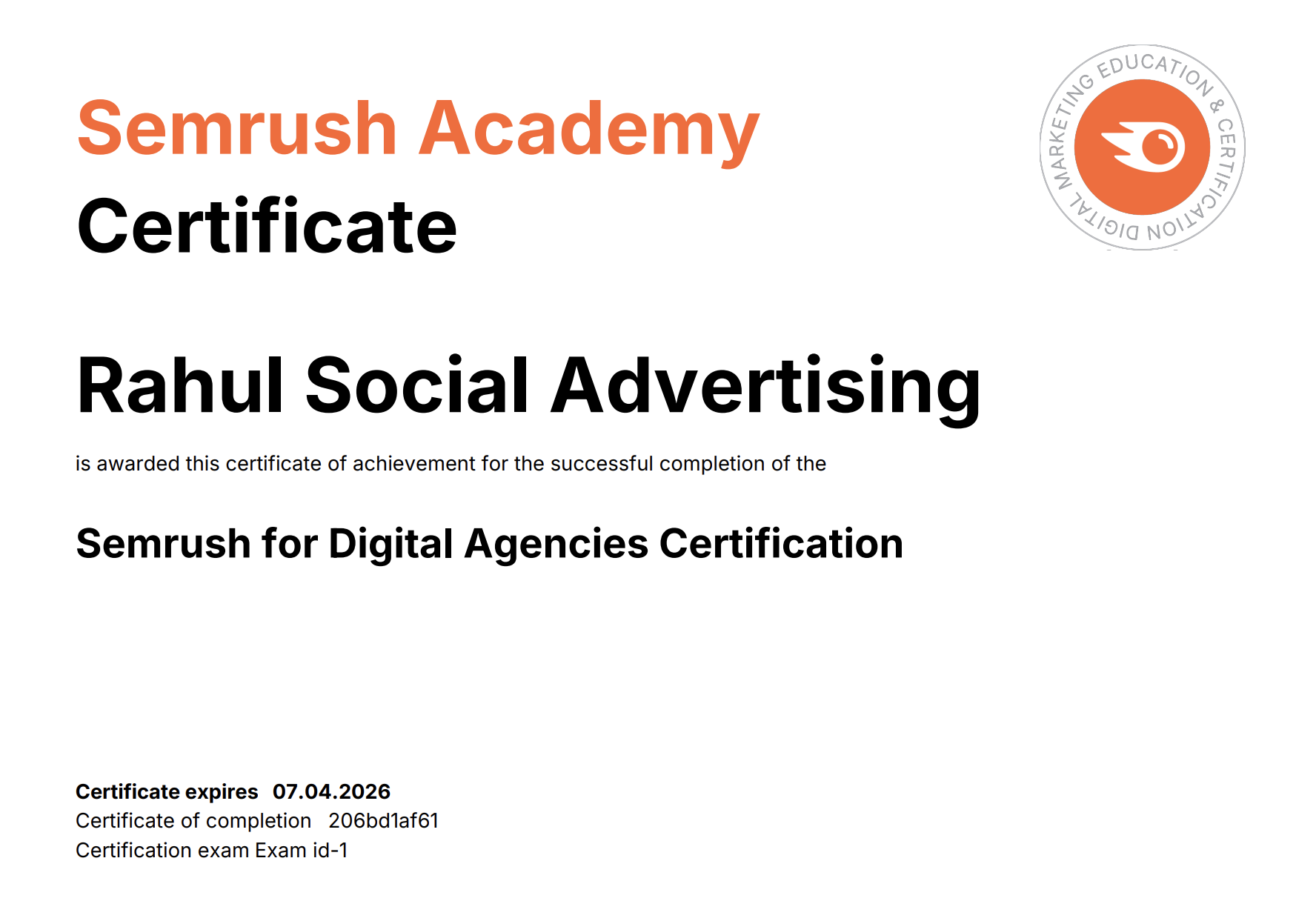 Rahul Social Advertising is a top Facebook Ads Agency in India and featured by semrush. This is a result-driven marketing agency and is recognized as a Facebook & Google Premier Partner. This most prominent title is awarded to only the top 3% of Facebook Ads Agency in India.